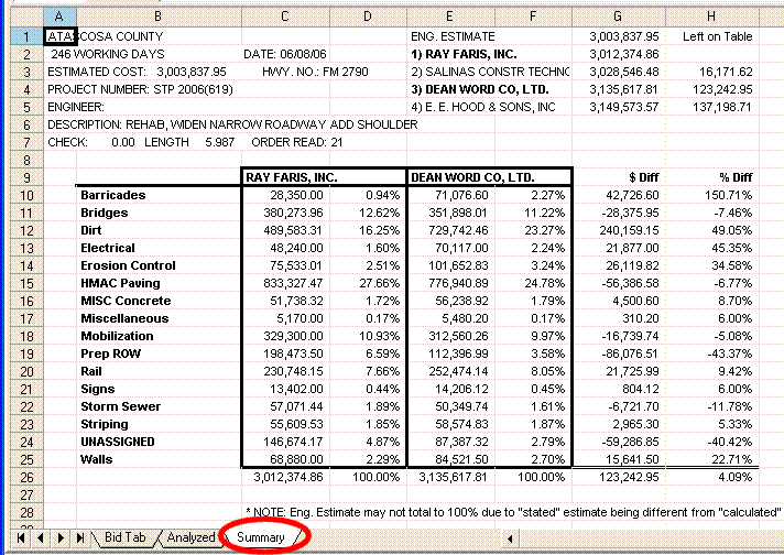 Bid Tab Analysis Summary Page, analyzing two contractors side by side: