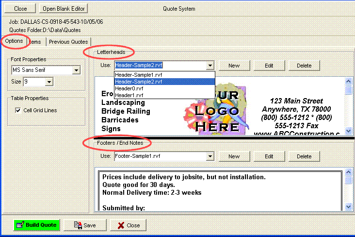 Easily Quote any bid item on the job. If you have multiple job headers (letterheads) or footers, simply choose the one you need from the options tab. The resulting Quote is extremely flexible in design and look, so you can customize to your liking.