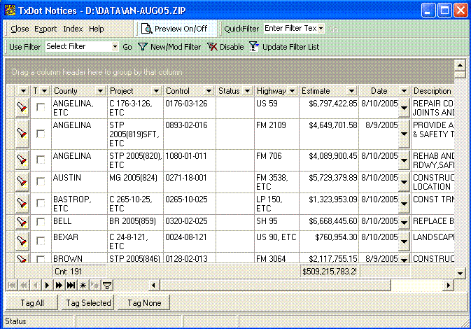 Filtering your data: below is a filter used to scan your data for jobs with the text "CONC" or the bid item "360" (or "0360"), but to ignore bid items that have the text "CURB", "REMOV", or the bid item starting with "104" (or "0104"). Also note the counties have been restricted to those within certain TxDot districts.